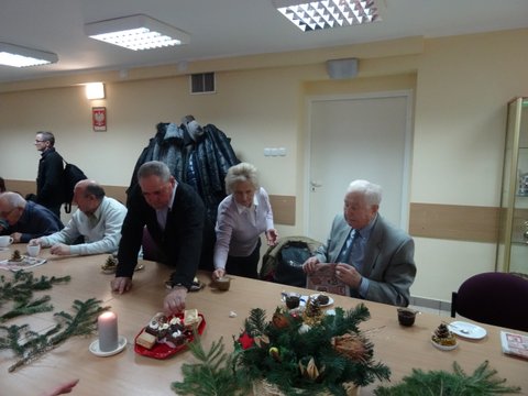 W tym roku instruktorka od stroików przeżywała utratę męża i w tej sytuacji Hania Frogowska wymyśliła stroiki dużej odmiany sosnowych szyszek. Na zakończenie po opłatku i składaniu sobie życzeń zaserwowaliśmy barszcz czerwony z kokietkami i pierogami.